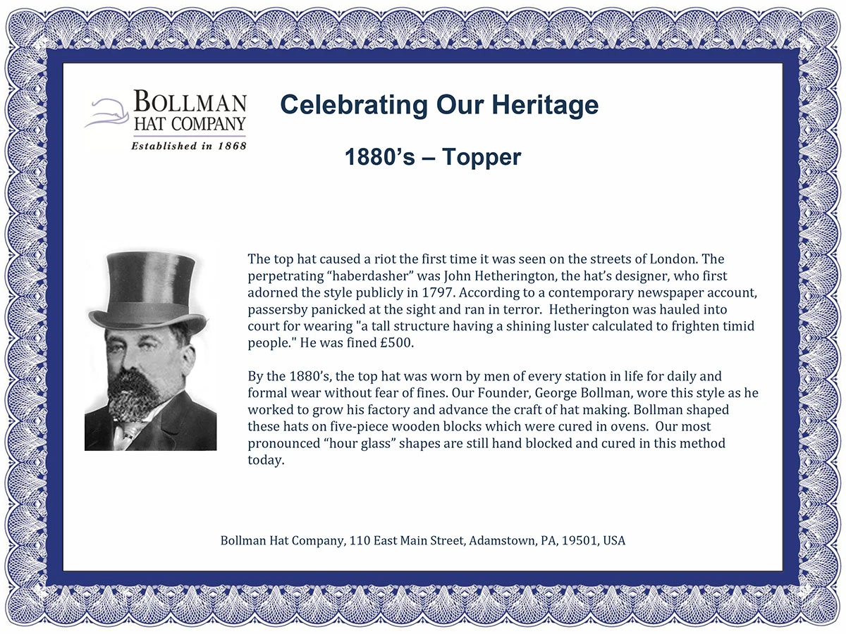 The Bollman Hat Company shaped these hats on five-piece wooden blocks which were cured in ovens. Bollman’s “hour glass” shapes are still hand blocked and cured in this method today.