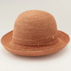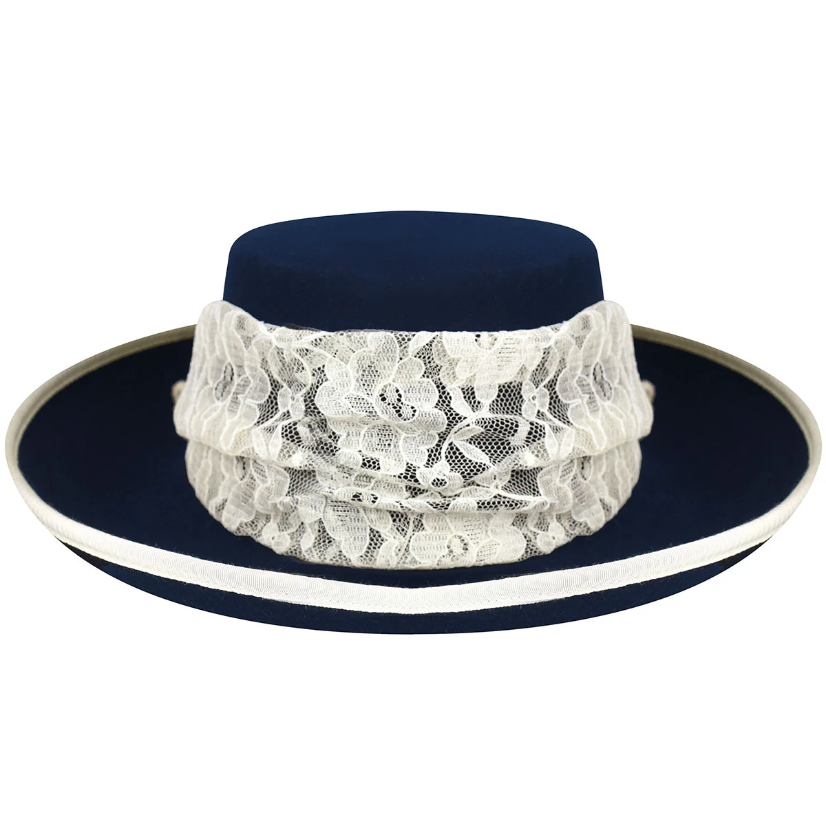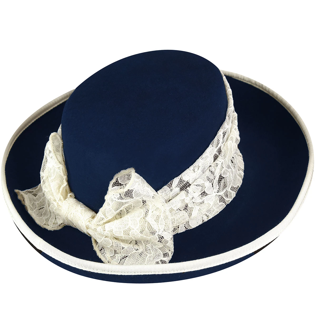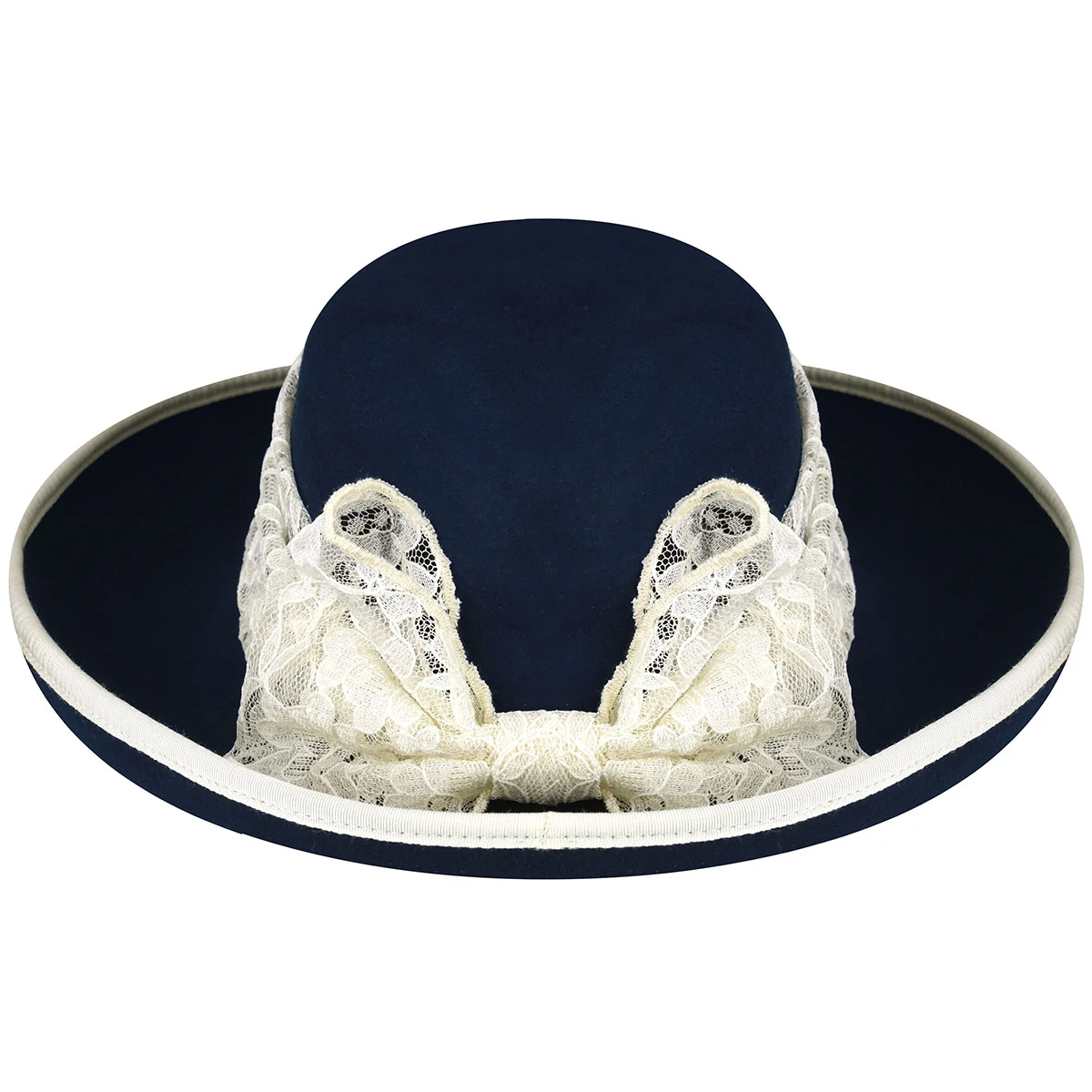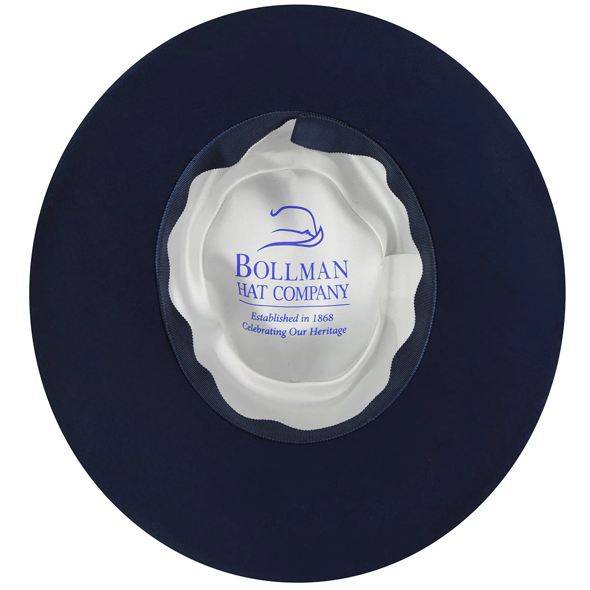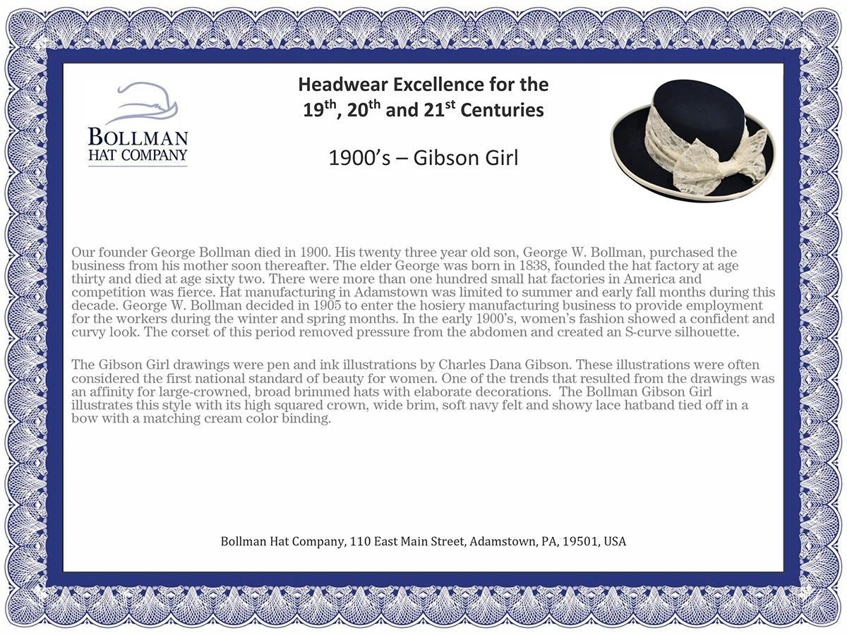 The Gibson Girl drawings were pen and ink illustrations by Charles Dana Gibson. These illustrations were often considered the first national standard of beauty for women. One of the trends that resulted from the drawings was an affinity for large-crowned, broad brimmed hats with elaborate decorations. The Bollman Gibson Girl illustrates this style with its high squared crown, wide brim, soft navy felt and showy lace hatband tied off in a bow with a matching cream color binding. This hat comes in a special edition Bollman Heritage Hat Box.