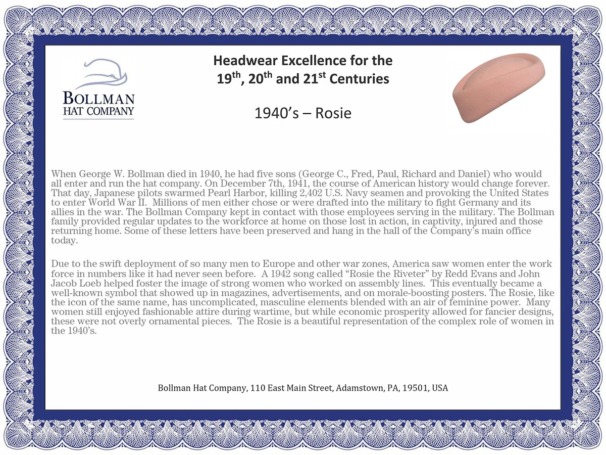 Due to the swift deployment of so many men to Europe and other war zones, America saw women enter the work force in numbers like it had never seen before. A 1942 song called “Rosie the Riveter” by Redd Evans and John Jacob Loeb helped foster the image of strong women who worked on assembly lines. This eventually became a well-known symbol that showed up in magazines, advertisements, and on morale-boosting posters. The Rosie, like the icon of the same name, has uncomplicated, masculine elements blended with an air of feminine power. Many women still enjoyed fashionable attire during wartime, but while economic prosperity allowed for fancier designs, these were not overly ornamental pieces. The Rosie is a beautiful representation of the complex role of women in the 1940’s. This hat comes in a special edition Bollman Heritage Hat Box.
