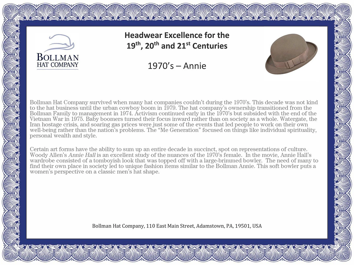 Certain art forms have the ability to sum up an entire decade in succinct, spot on representations of culture. Woody Allen’s Annie Hall is an excellent study of the nuances of the 1970’s female. In the movie, Annie Hall’s wardrobe consisted of a tomboyish look that was topped off with a large-brimmed bowler. The need of many to find their own place in society led to unique fashion items similar to the Bollman Annie. This soft bowler puts a women’s perspective on a classic men’s hat shape. This hat comes in a special edition Bollman Heritage Hat Box.