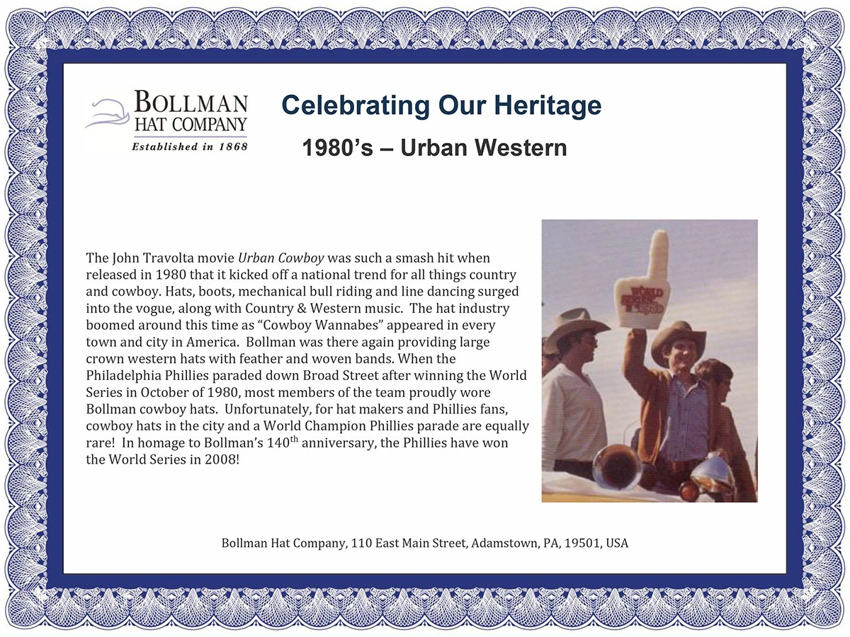 The John Travolta movie Urban Cowboy was such a smash hit when released in 1980 that it kicked off a national trend for all things country and cowboy. Hats, boots, mechanical bull riding and line dancing surged into the vogue, along with Country & Western music. The hat industry boomed around this time as ‘Cowboy Wannabes’ appeared in every town and city in America. Bollman was there again providing large crown western hats with feather and woven bands. When the Philadelphia Phillies paraded down Broad Street after winning the World Series in October of 1980, most members of the team proudly wore Bollman cowboy hats. This hat comes in a special edition Bollman Heritage Hat Box.
