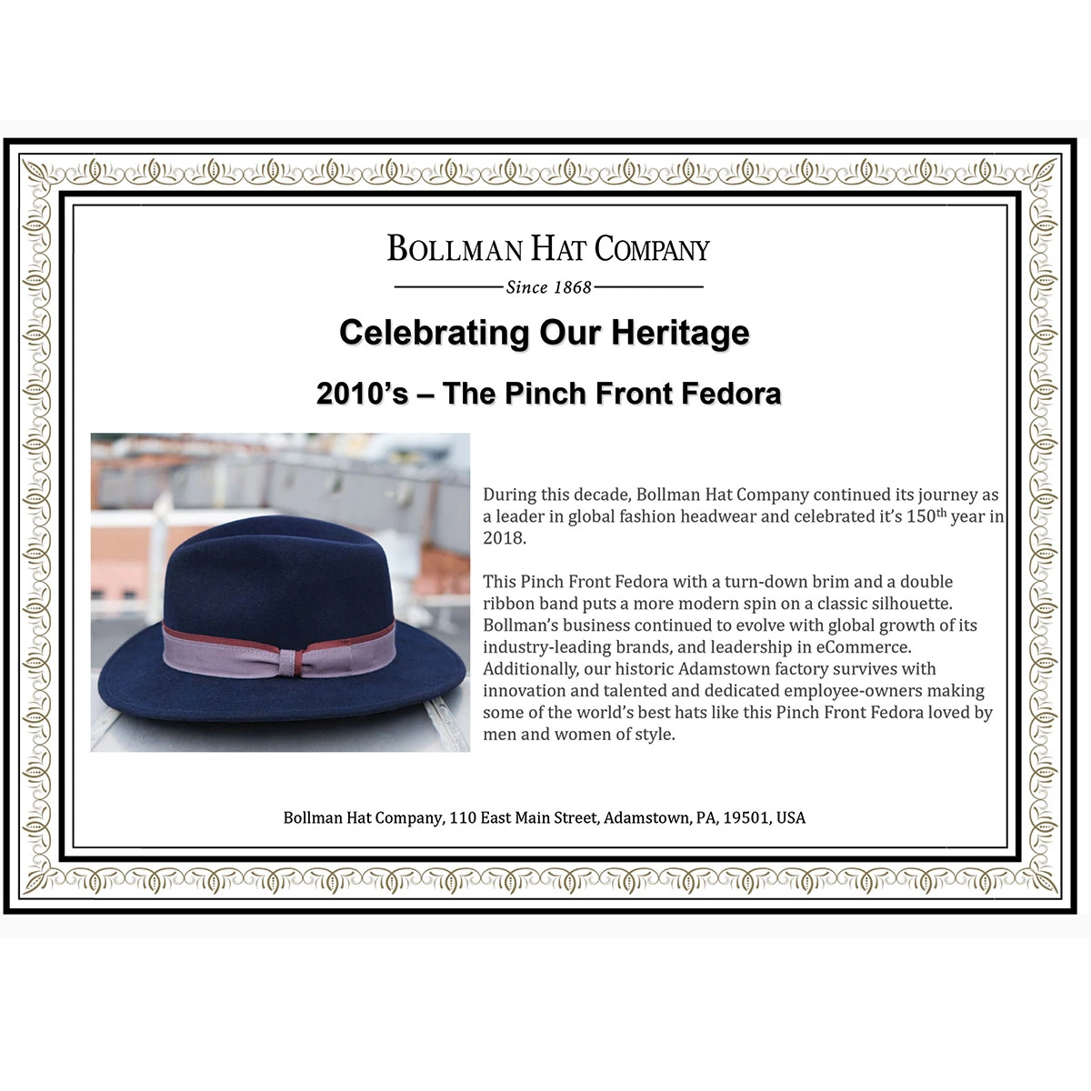 This Pinch Front Fedora with a turn-down brim and a double ribbon band puts a more modern spin on a classic silhouette. Bollman’s business continued to evolve with global growth of its industry-leading brands, and leadership in eCommerce. Additionally, the historic Adamstown factory survives with innovation and talented and dedicated employee-owners making some of the world’s best hats like this Pinch Front Fedora, loved by men and women of style.