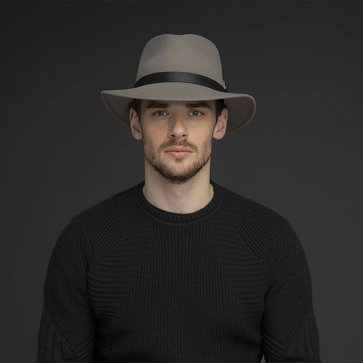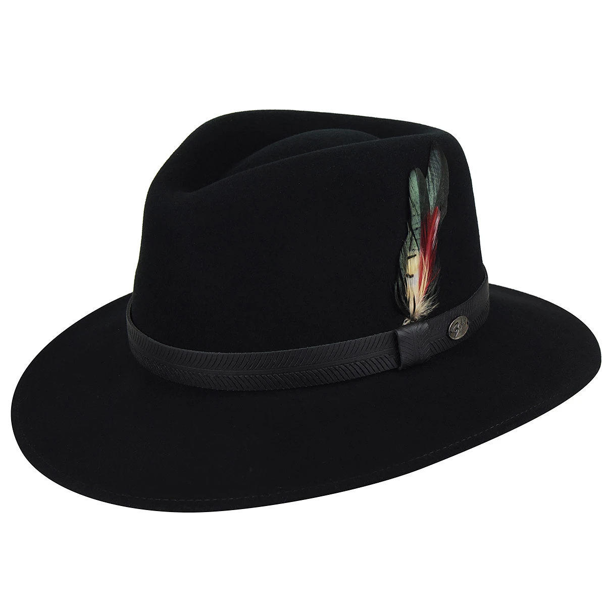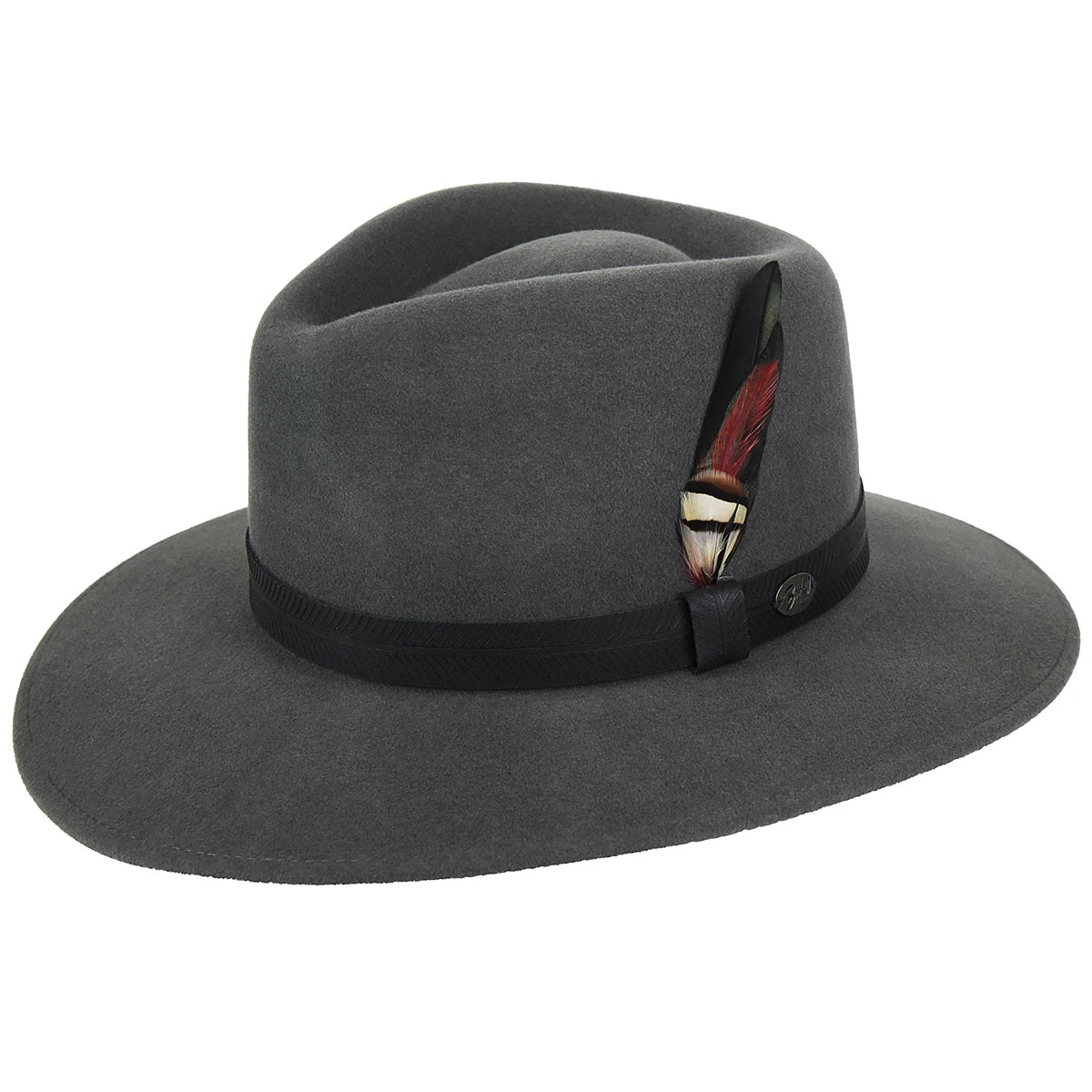 Abbott by Bailey 1922 is blocked in their proprietary Lanolux® finish which offers superior shape retention in a fine sueded finish. It has a 3″ brim and teardrop crown that is accented with a leather band that features a curled herringbone pattern debossed onto the surface. It also had a feather that is removeable.