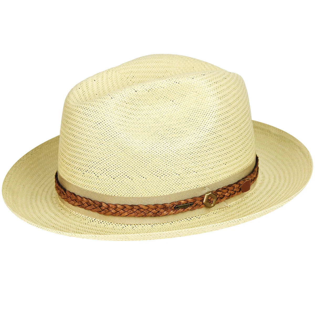 The Bevers Fedora by Bailey 1922 is a classic fedora featuring Baileys LiteStraw® finish. It features a center dent with a medium brim accented with a Japanese grosgrain band and leather braided band that is centered and stitched on top. The leather band features an antiqued metal diamond-shaped trim, while a thin bar logo finishes the style.