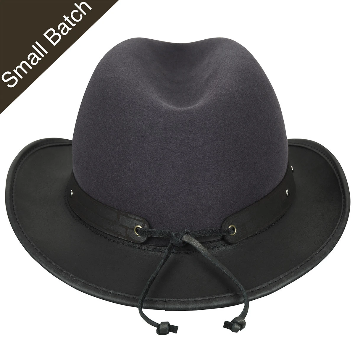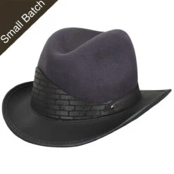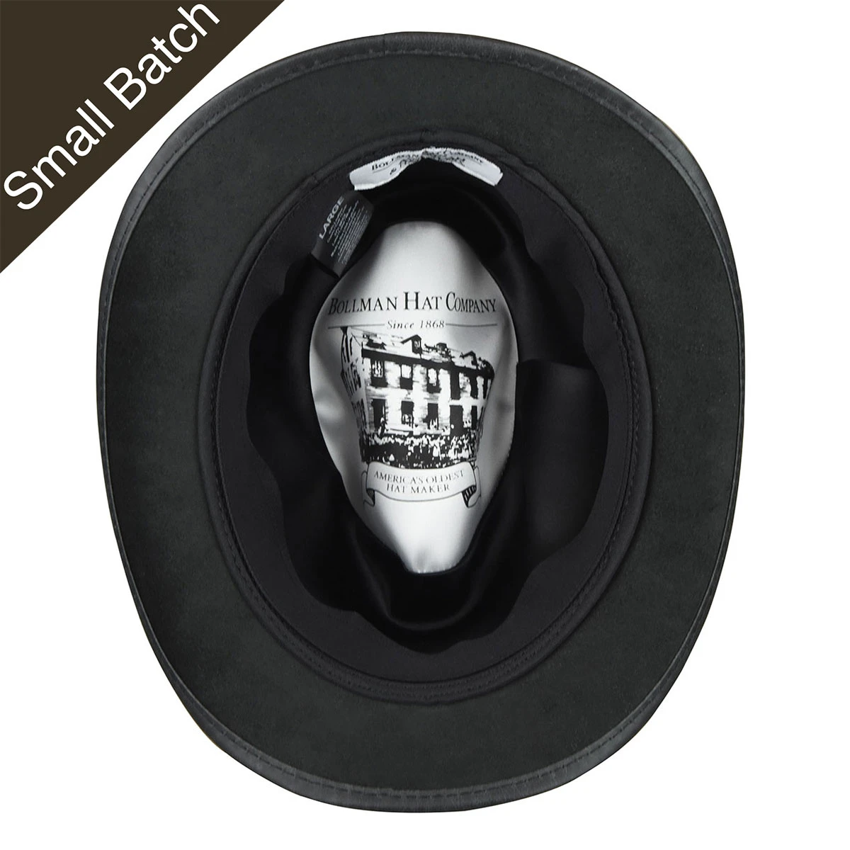 The Bollman by Bollman Hat Company and American Hat Makers is an ode to the early days: to the former whiskey distillery which was the birthplace of Bollman Hat Company and to the brick which adorns the inside and outside of our Adamstown factory. Hand-crafted from a luxurious velvet-like Elite Felt, the Bollman features a laser-etched leather band that features the factory brick wall. The detailing in this leather band is exquisite and one-of-a-kind, adding an artistic edge while the leather brim adds a western ruggedness element to the fedora. The Bollman is fully lined with satin lining and comes in a novelty Bollman Hat Company hatbox for safe storing.