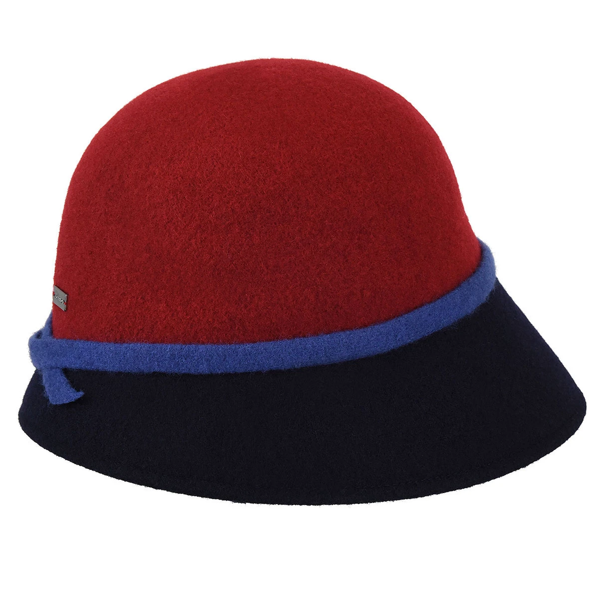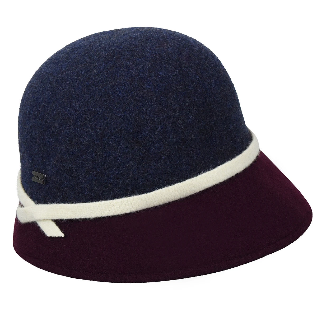 The Colette Colorblock Cloche by Betmar is a stylish, wool felt cloch featuring an asymmetric brim and round crown. The contrast band is in the same wool felt material as the balance of the cloche. The Colette is finished with the signature Betmar pin.