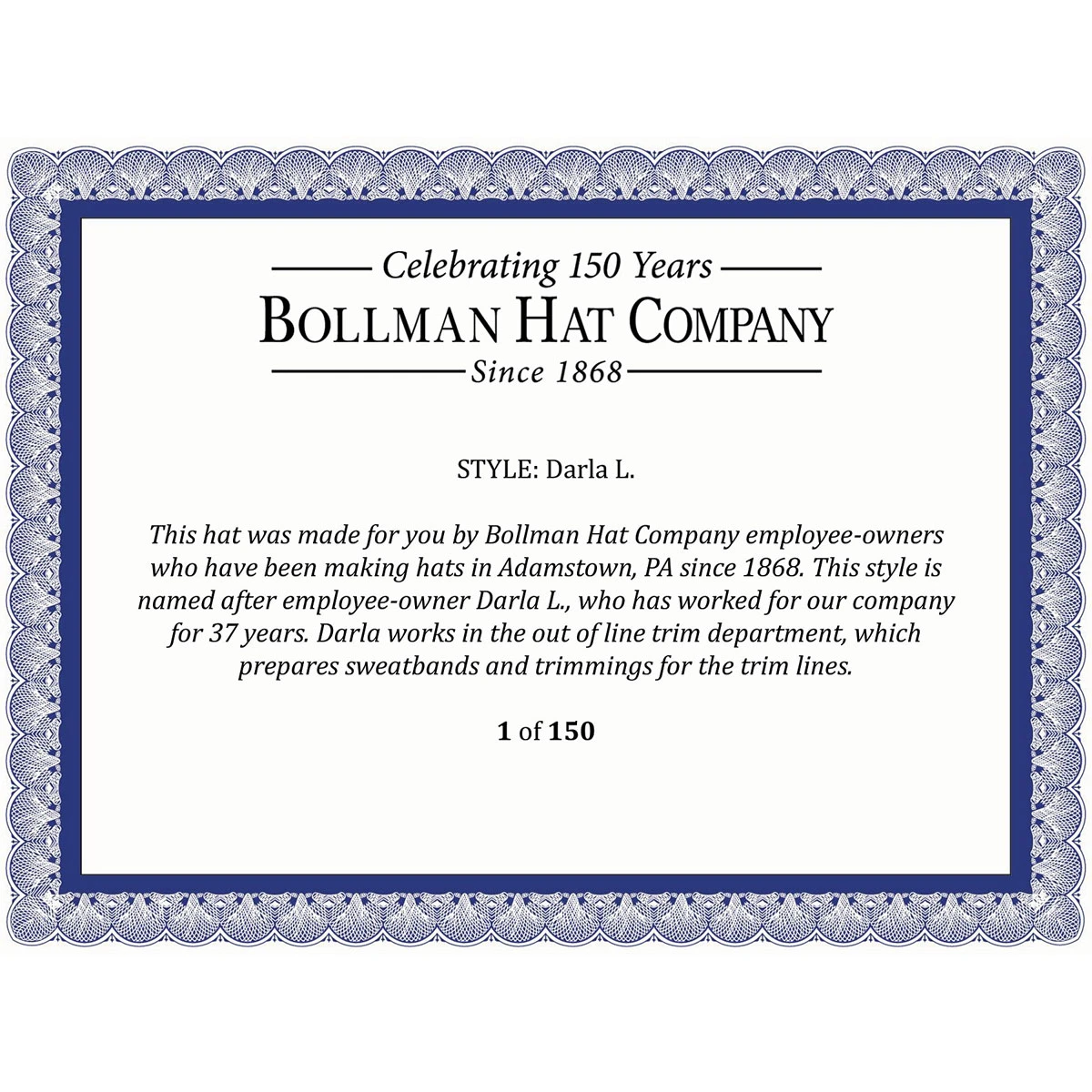 The Darla L. is from the Bollman Hat Company Makers’ Collection, a selection of hats launched in our 150th year to celebrate the spirit, craftsmanship, and heritage of Bollman Hat Company and our employee-owners. Named after an employee-owner with at least 35 years of service, each hat comes with a numbered certificate of authenticity signed by employee-owners, a photo of employee-owners in our Adamstown, PA factory, and a branded hat box.