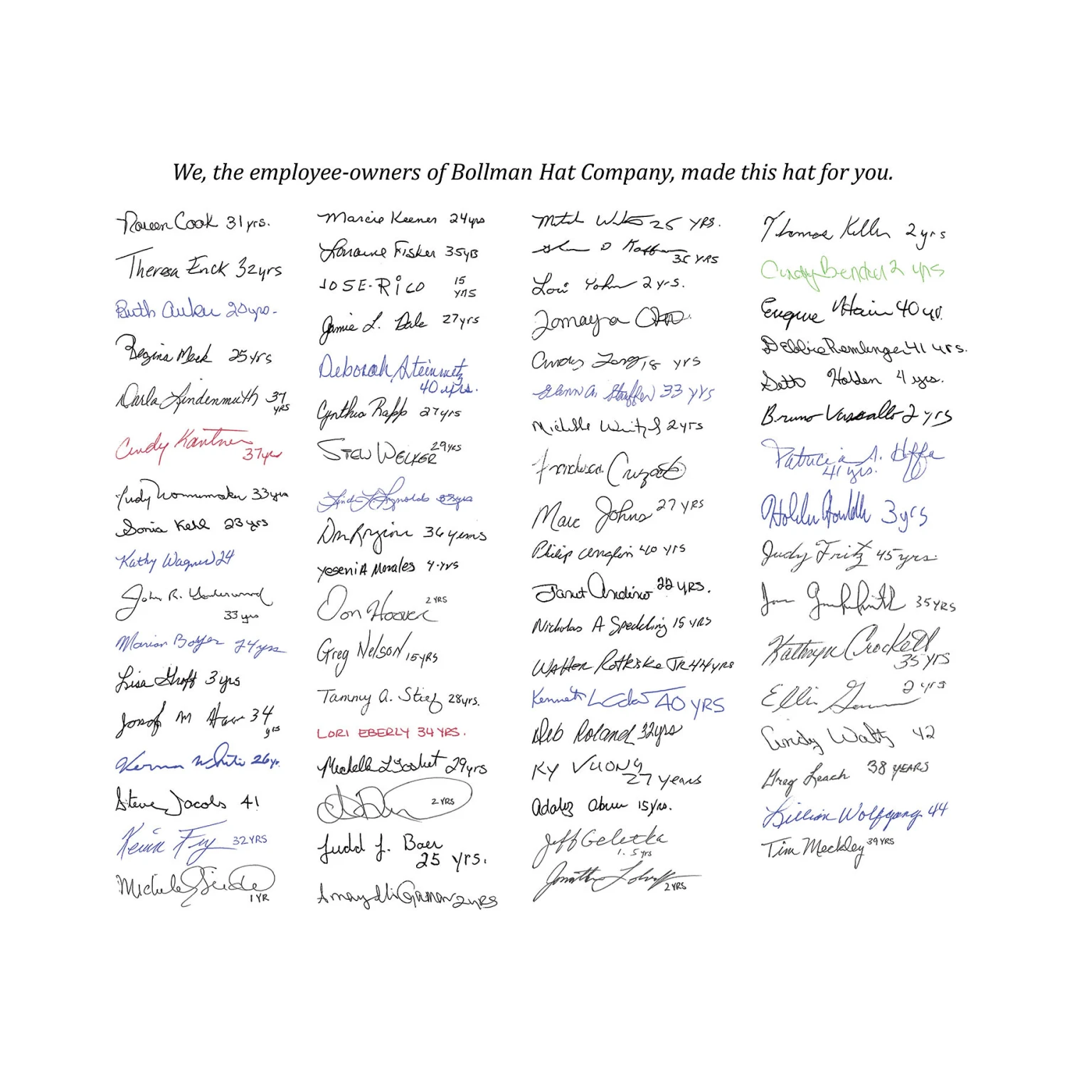 - Bollman Hat Company laser-etched felt logo centered in the back of the hat commemorating Bollman’s 150 year heritage