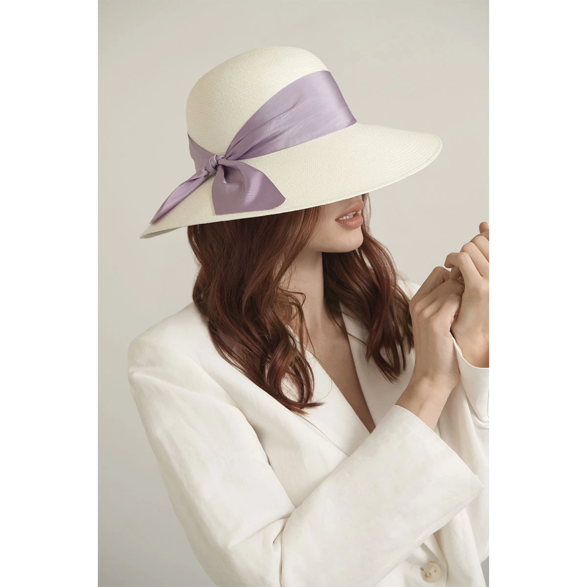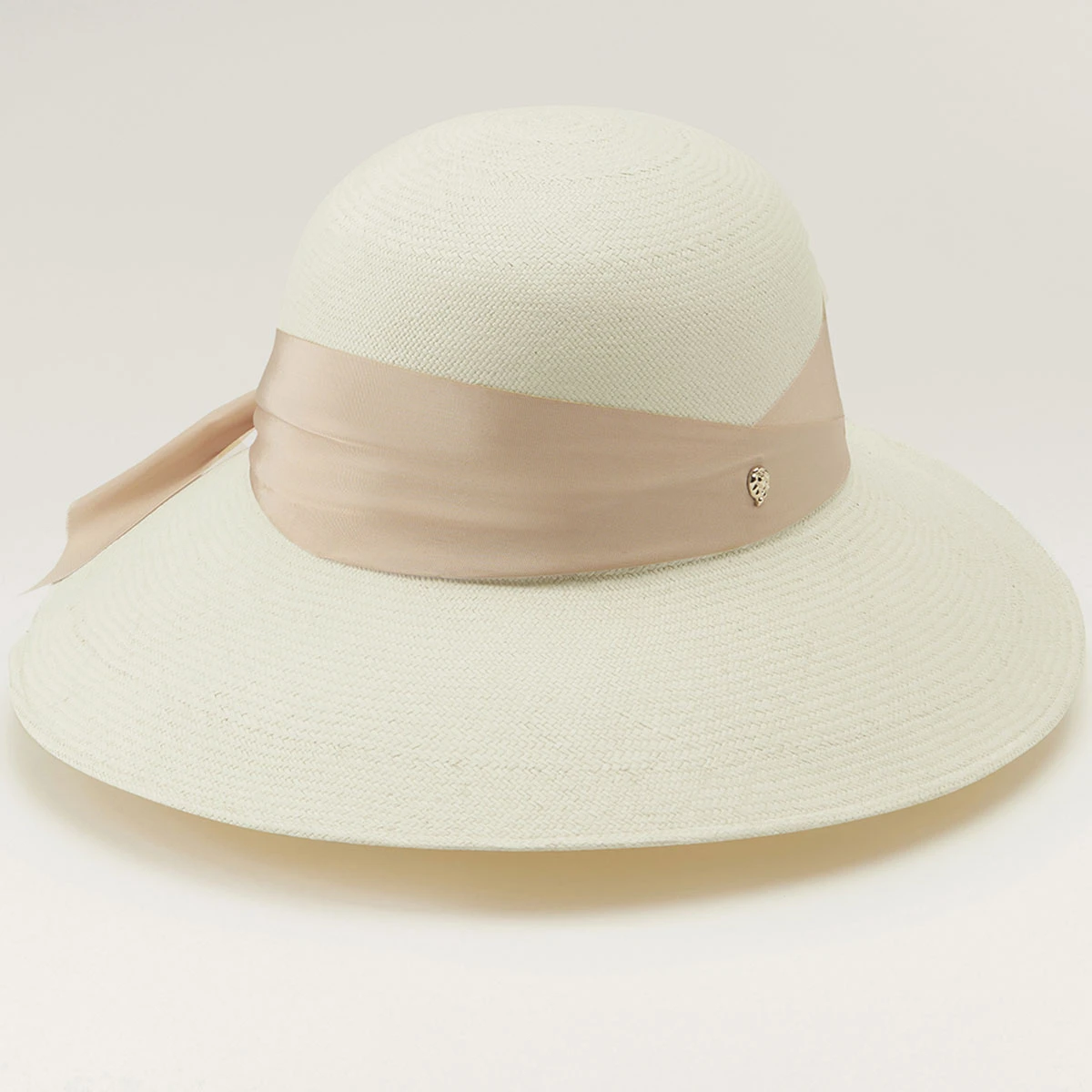 The Dusk by Helen Kaminski is a luxurious genuine panama wide brim sun hat. It features a cross-over grosgrain detail hat band with the Helen Kaminski seed detail at the center cross. The other side has a large knot detail. If you are looking for a beautiful, feminine genuine panama hat, the Dusk is it.