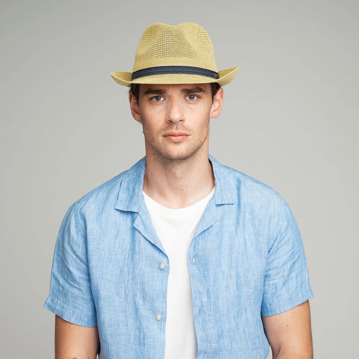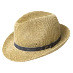 Soft and light in weight, the Bailey 1922 Elliot intricately knits a combination of paper straw and thermo straw in a garter bond that maintains its trilby shape in spite of wear and tear. A slim grosgrain band nicely features a natural Bailey wood chip logo and offers a neat contrast over the breezy paper stitch. A custom Bailey soft polyester sweatband allows this light pre-snapped trilby to sit snugly but comfortably.