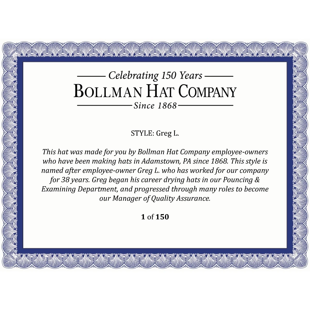 The Greg L. is from the Bollman Hat Company Maker’s Collection, a selection of hats launched in our 150th year to celebrate the spirit, craftsmanship, and heritage of Bollman Hat Company and our employee-owners. Named after an employee-owner with at least 35 years of service, each hat comes with a numbered certificate of authenticity signed by employee-owners, a photo of employee-owners in our Adamstown, PA factory, and a branded hat box.