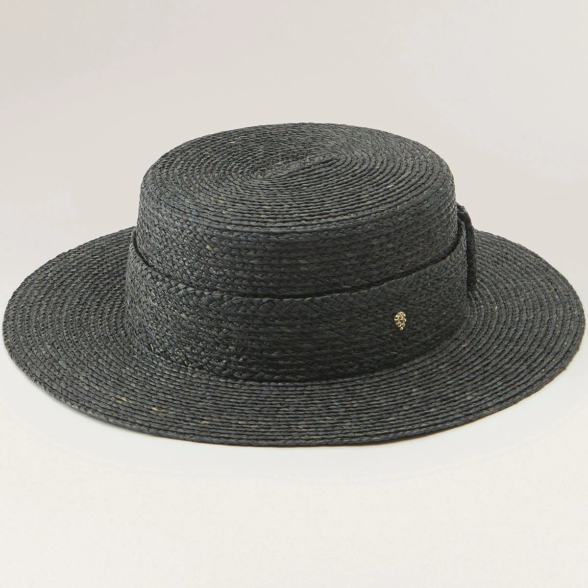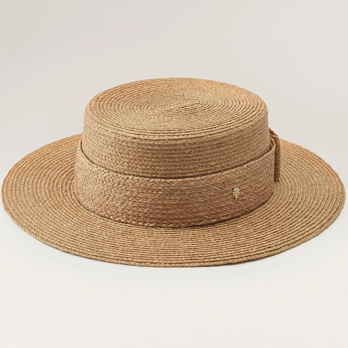 The Hester Boater by Helen Kaminski is a classic raffia braid boater. The shorter brim boater features a flat top crown accented with a self raffia braid trim with bow detail at center back. The sateen elastic size adjustable inner band allows for the ideal fit. THe Hester Boater is UPF50+ rated for ultimate sun protection.