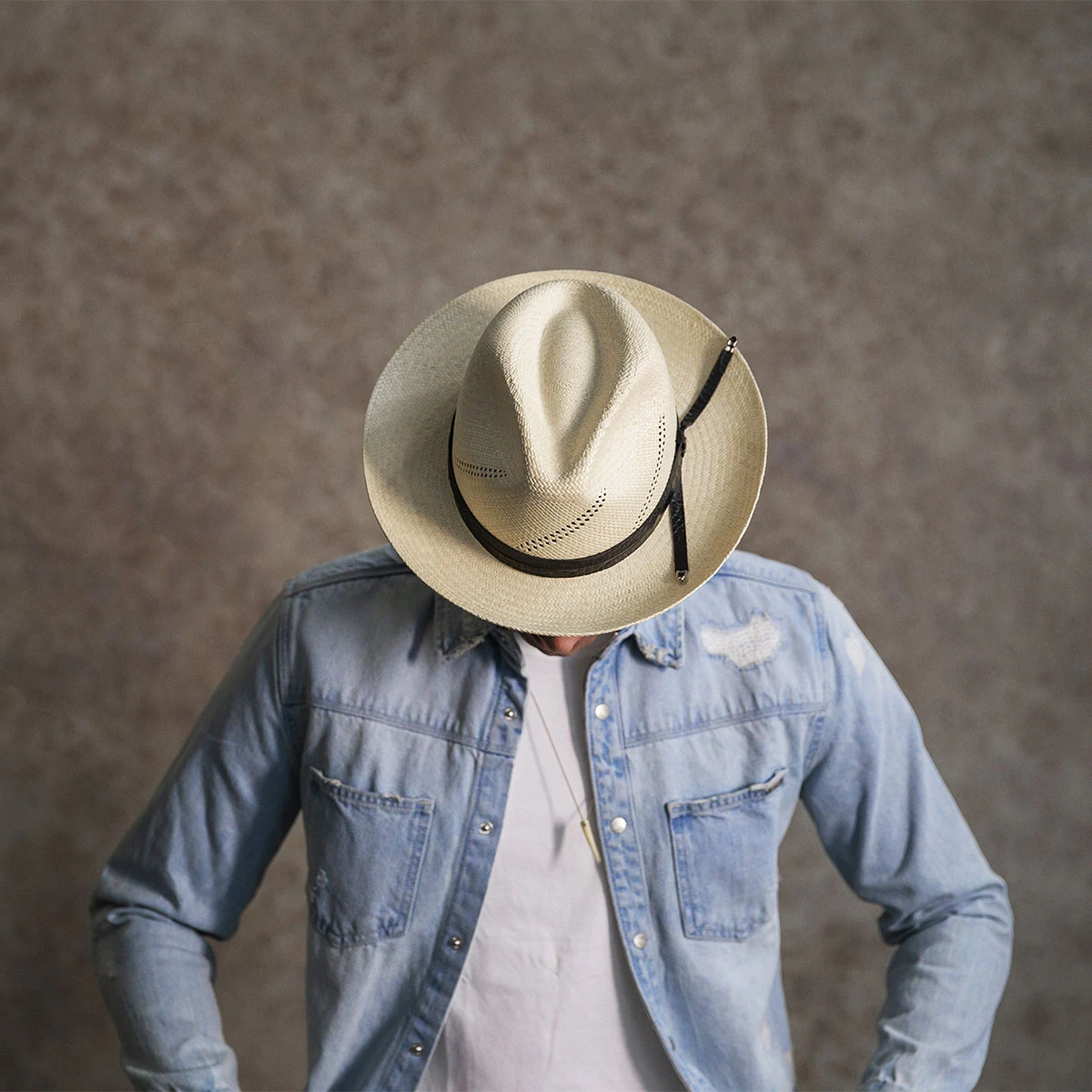The Jansen by Bailey 1922 is a western inspired Genuine Panama with a twist. The classic medium brim fedora features a swirling venting pattern and a half glossy, half matte croc embossed leather band wrapped around the hat twice and finished with a crosspiece. Metal trims were added to the ends and cross piece to add a western edge to the style.