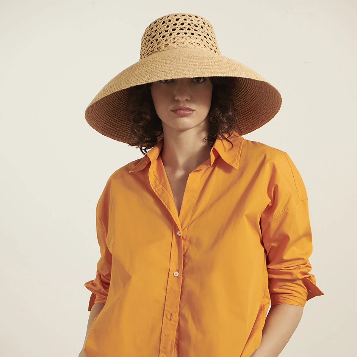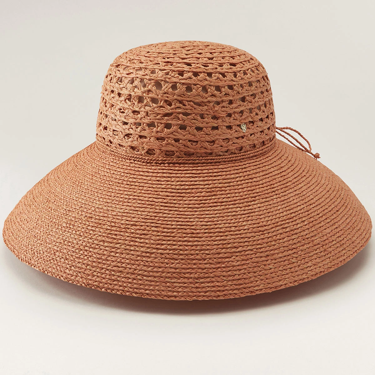 The Jeany Wide Brim Bucket by Helen Kaminski combines different braiding techniques to create a beautiful bucket hat. The crown is crafted from an open weave crochet braid, while the wide down angle brim is crafted from a tight crochet braid. It is accented with two handrolled raffia strings for size. This style is not lined.