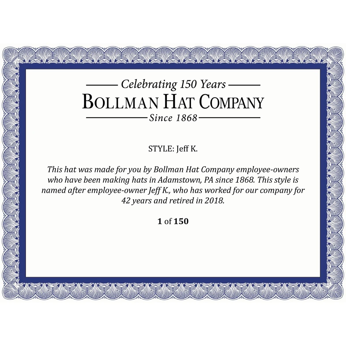 The Jeff K. is from the Bollman Hat Company Maker’s Collection, a selection of hats launched in our 150th year to celebrate the spirit, craftsmanship, and heritage of Bollman Hat Company and our employee-owners. Made exclusively for Hats.com and named after an employee-owner with at least 35 years of service, each hat comes with a numbered certificate of authenticity signed by employee-owners, a photo of employee-owners in our Adamstown, PA factory, and a branded hat box.