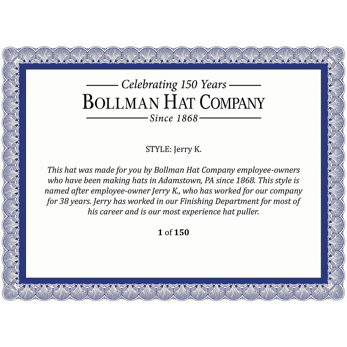The Jerry K. is from the Bollman Hat Company Makers’ Collection, a selection of hats launched in our 150th year to celebrate the spirit, craftsmanship, and heritage of Bollman Hat Company and our employee-owners. Named after an employee-owner with at least 35 years of service, each hat comes with a numbered certificate of authenticity signed by employee-owners, a photo of employee-owners in our Adamstown, PA factory, and a branded hat box.