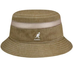 The Distressed Cotton Mesh Bucket by Kangol is crafted from a heavily washed cotton blend fabric combined with an airy mesh crown insert for the perfect beach style. The contrast topstitching and logo give it a workwear feel, and the bungee adjuster in the back gives it a custom fit. It features Kangols’ signature kangaroo embroidery at the front.