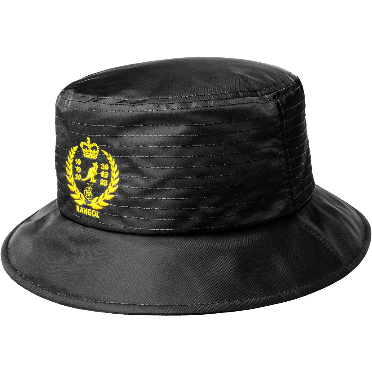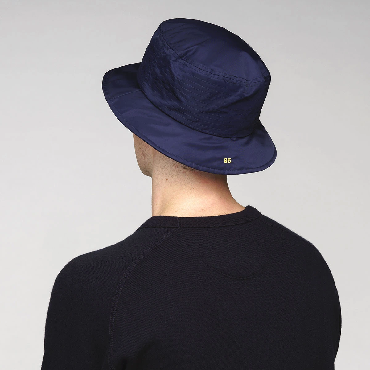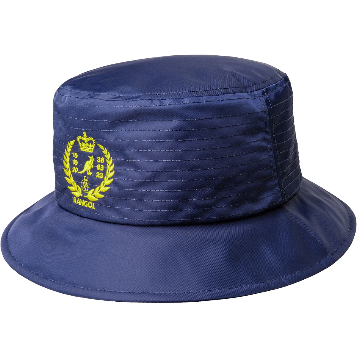 The Royal Leisure Bucket by Kangol is crafted from a silken nylon inspired by military bomber jackets. It features a custom golden laurel embroidery logo to honor Kangols’ 85th anniversary of the brand and give it an ivy league/royal crest feel. Kangol was started in the UK in 1938, made popular in New York City in 1983, and in 2023 it still stands as a heritage brand. The topstitching around the crown gives this a nice structure and texture, and the “85” embroidery hit at the center back brim ties it all together.