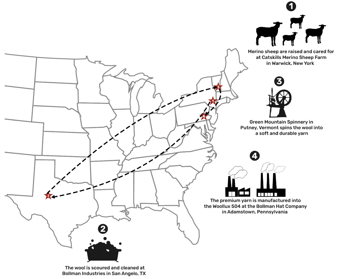 The wool for the USA Woollux 504 Cap comes from merino sheep raised in the Catskills of New York. Our 100% sourced and made in the USA merino wool is a sustainable, harm free fiber harvested in New York, washed in Texas, spun into yarn in Vermont and made into a hat in Pennsylvania by Employee-Owners.