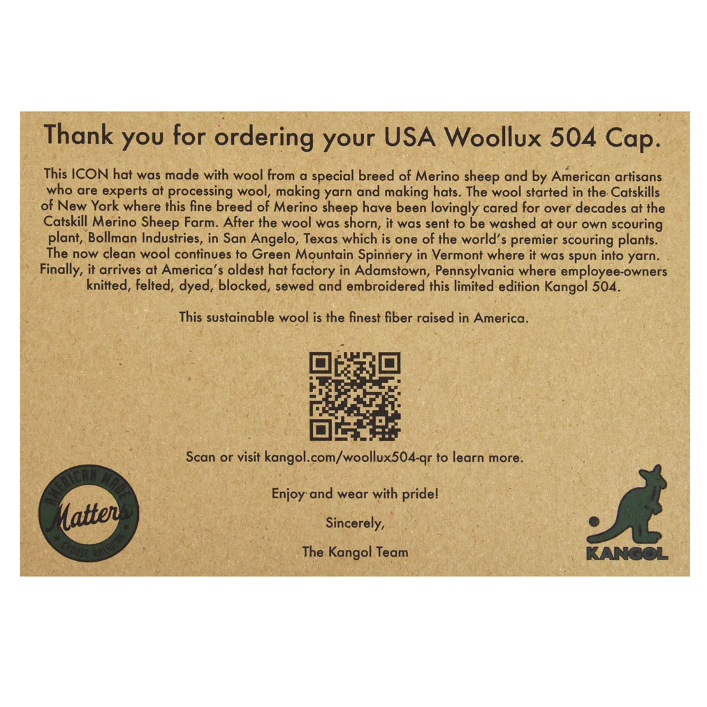 The USA Woollux 504 Cap features an embroidered Kangol logo and Kangaroo on the back of the cap, along with a comfort stretch sweatband. The Woollux 504 ships in a novelty Kangol hat box and includes a hat brush to keep your hat looking clean and fresh.