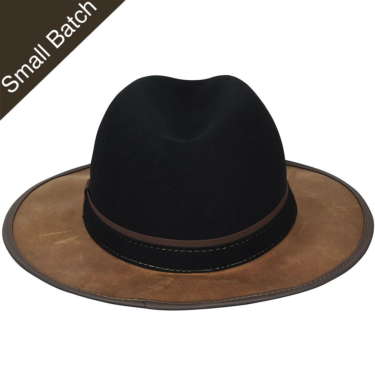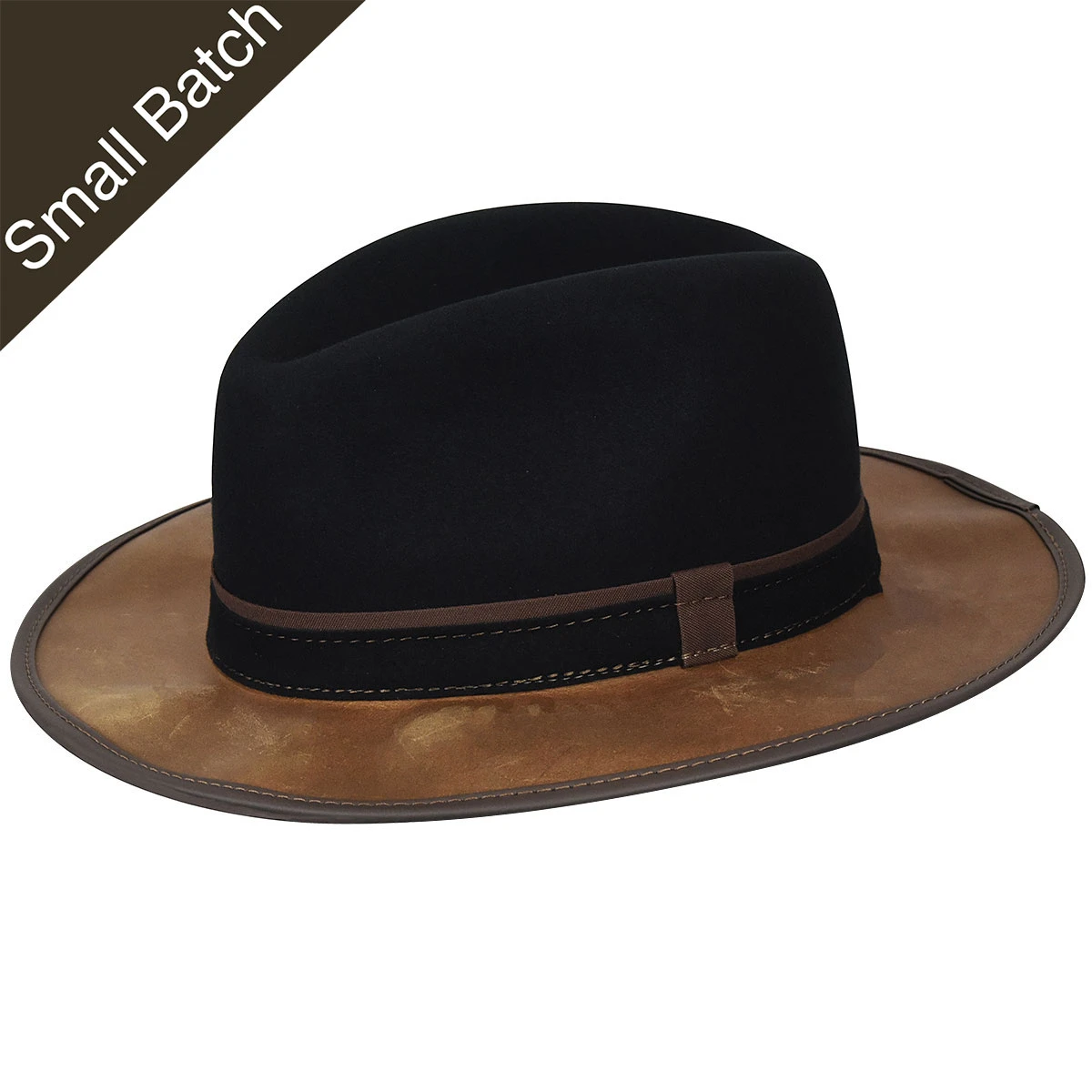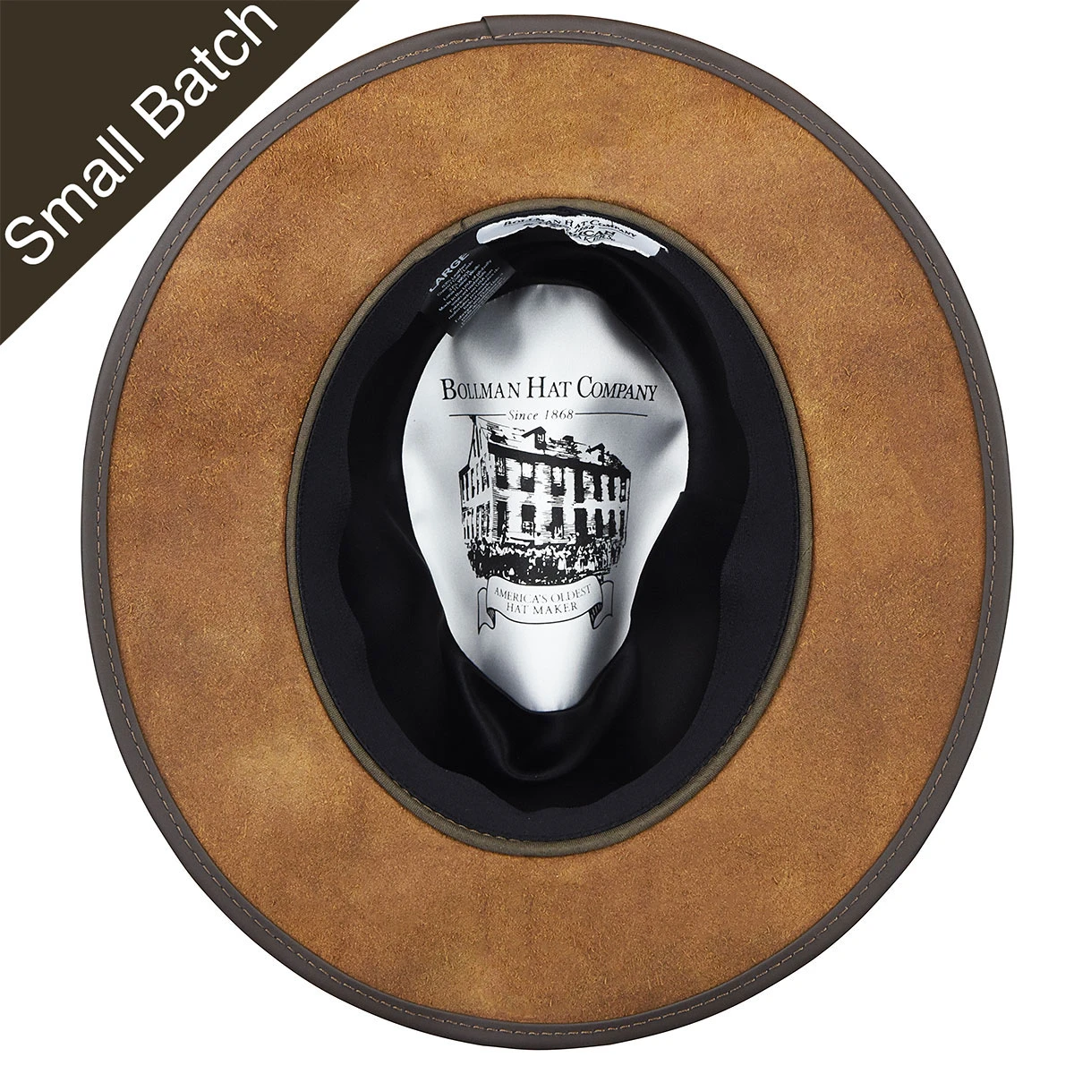 The Leisey by Bollman Hat Company and American Hat Makers is an ode to the days of western ruggedness and outlaws. Handcrafted from a luxurious velvet-like Elite Felt and genuine pull-up leather brim, the Leisey features an outback crown and 2.5” dimensional brim. The genuine leather brim adds an edge of ruggedness while allowing the natural variations of color in the leather to add dimension and unique characteristics to it. Pull-up leather naturally has scratches. The Leisey is fully lined with satin lining and comes in a novelty Bollman Hat Company hatbox for safe storing.