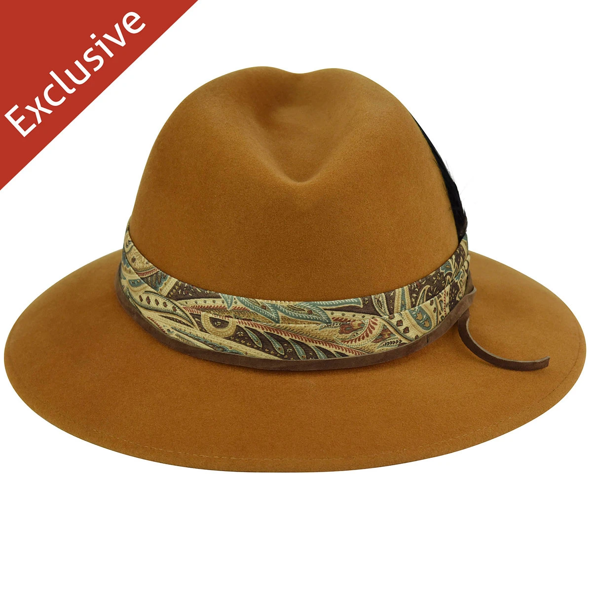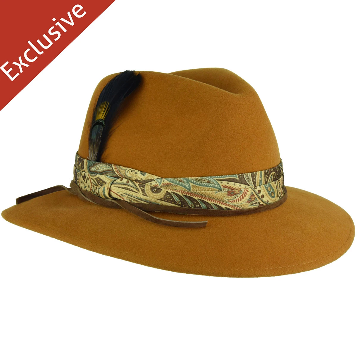 - Pleated paisley puggaree band and leather cord set off the gold hue of the hat