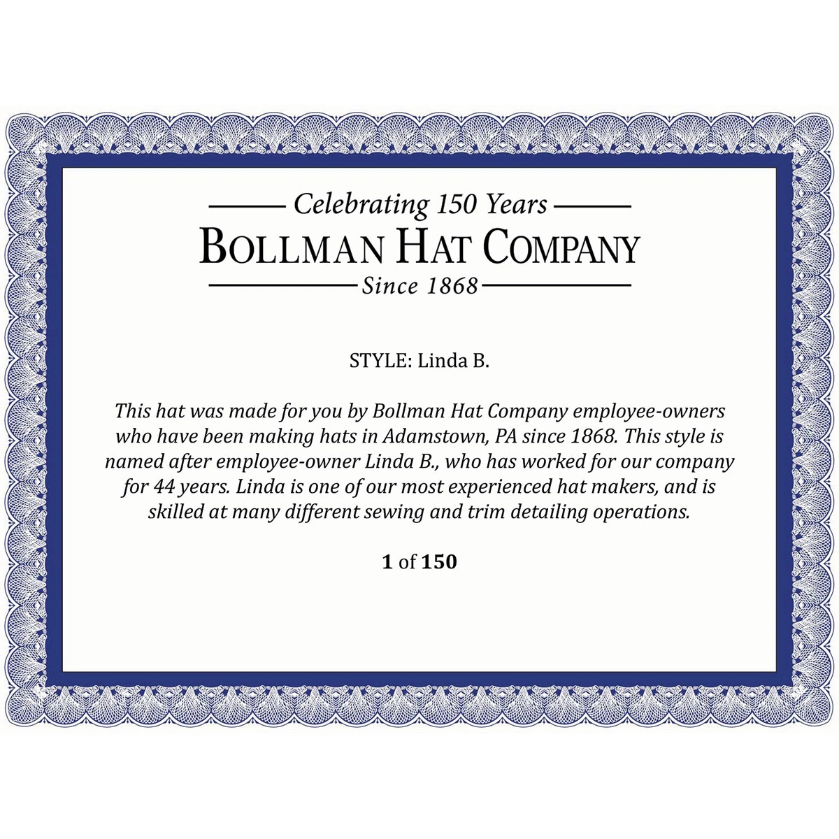 The Linda B. is from the Bollman Hat Company Makers’ Collection, a selection of hats launched in our 150th year to celebrate the spirit, craftsmanship, and heritage of Bollman Hat Company and our employee-owners. Named after an employee-owner with at least 35 years of service, each hat comes with a numbered certificate of authenticity signed by employee-owners, a photo of employee-owners in our Adamstown, PA factory, and a branded hat box.
