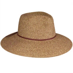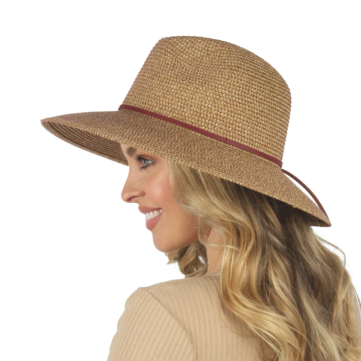 The Marled Straw PU Band Fedora by David & Young is a chic and casual fedora. It is accented with a simple, PU hatband that is knotted at center back. It has a comfort sweatband for all-day wear, and a size adjustable inner cording for a secure fit.