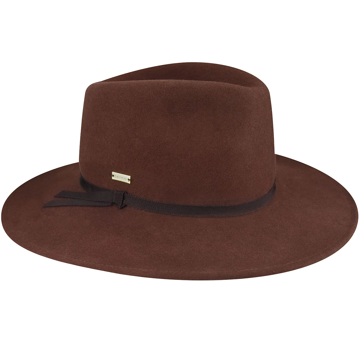 The Mireille by Betmar is a new LiteFelt® fedora that is sophisticated and chic. Featuring a center dent crown and a wider brim, it is finished with a Japanese grosgrain ribbon with a simple side knot. The Mireille is finished with the Betmar logo pin and an adjustable sweatband for comfort and sizing.