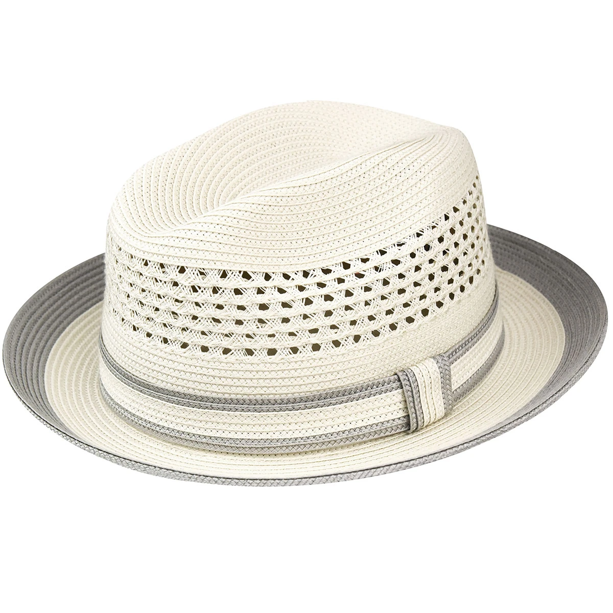 This unique two-tone fedora is made with a durable polypropylene braid. A great spring and summer style, the center dent crown on the Noah is vented to keep your head cool.