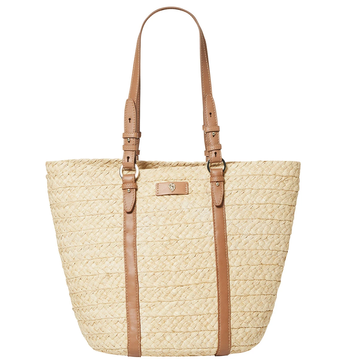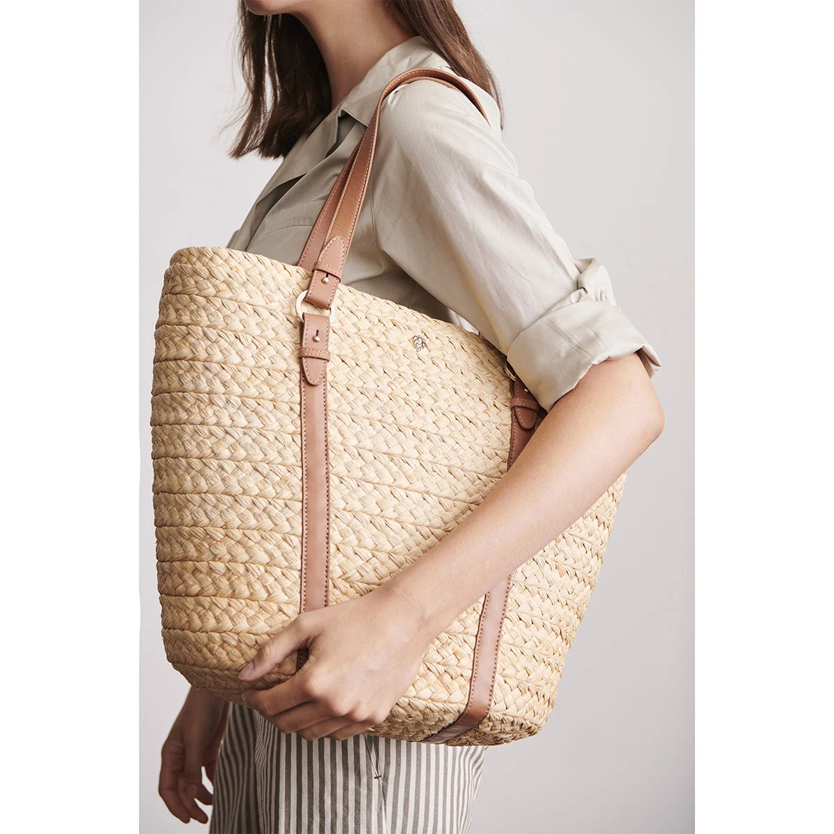 The Pinimilla Large Bridle Basket by Helen Kaminski is a classic wide braid raffia basket with vintage equestrian inspired strap details. The large tote features leather straps and a cotton zip top ‘drop-in’ lining.