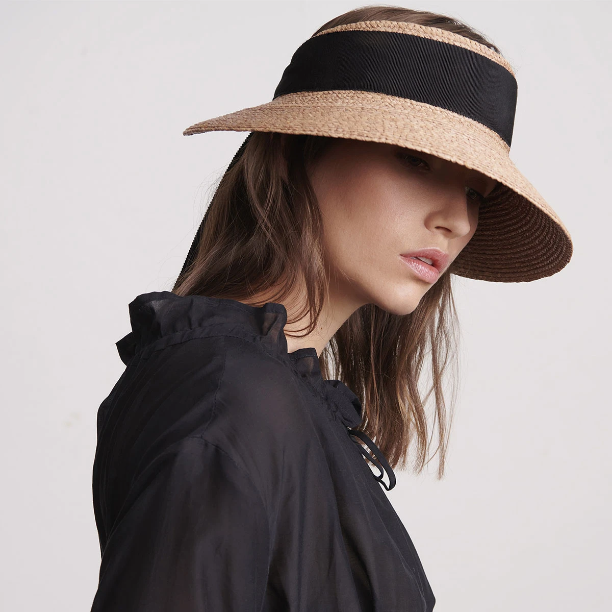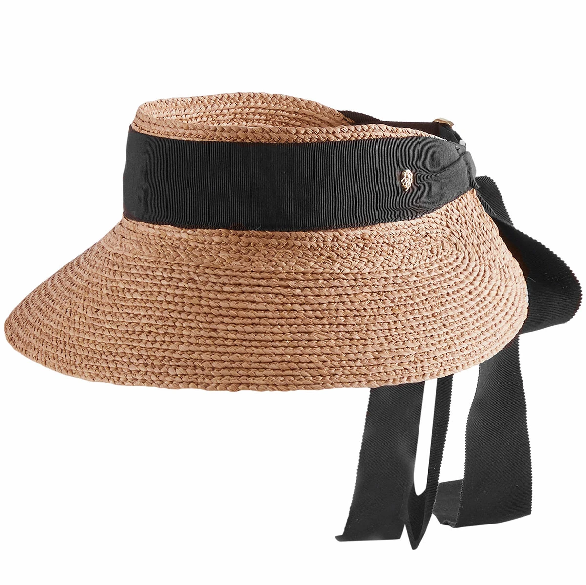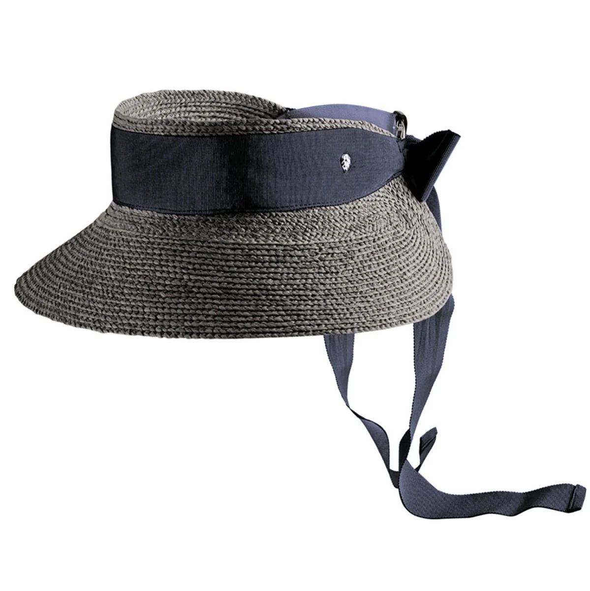 The Sabina Visor by Helen Kaminski is a classic summer-time visor that is chic and tasteful. Crafted from raffia braid, the Sabina features a medium peak accented with an Italian grosgrain ribbon trim tied in a bow at center back. It does have an elastic adjuster for the perfect fit in addition to the ribbon tie. The neoprene inner band will be keep you comfortable as you wear it all day. There is also a hook for attaching to bag, making the Sabina the perfect travel companion.