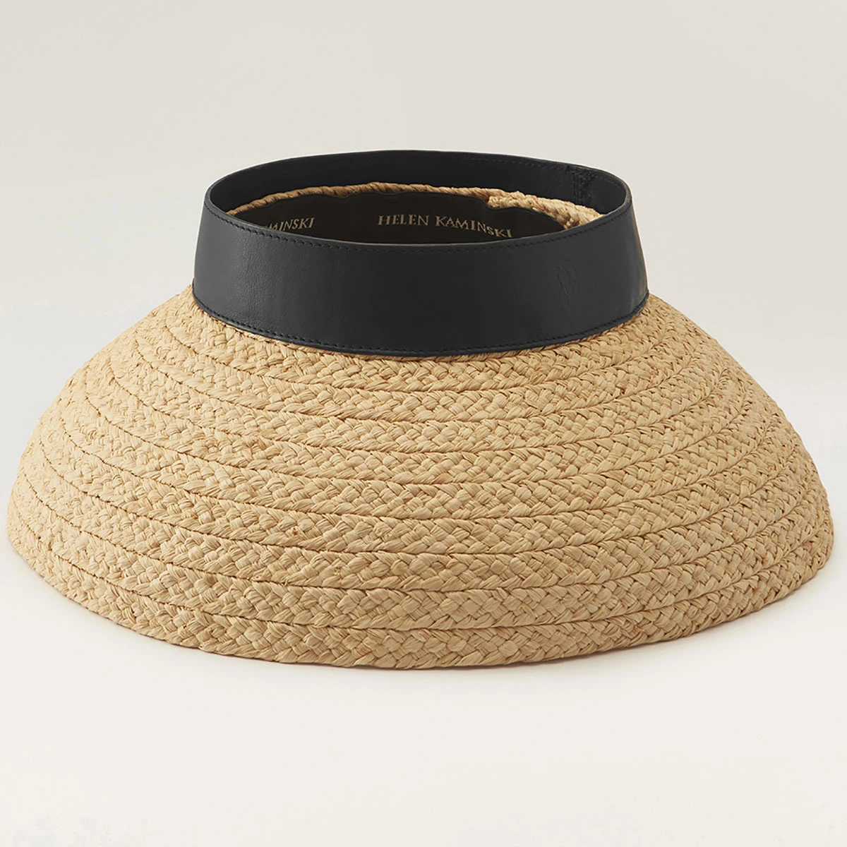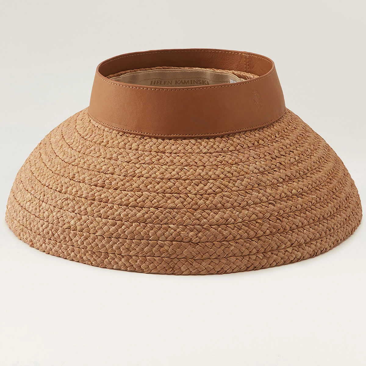 The Saoirse Visor by Helen Kaminski is a new visor shape that is sure to be a summer-time favorite. Crafted from wide raffia braid, the brim is a wide down angle brim that goes all the way around to give you the ultimate sun protection. The crown of the visor is crafted from leather, mixing two luxurious materials to make a unique new style. The Saoirse is a visor meets wide brim hat – just without the crown.