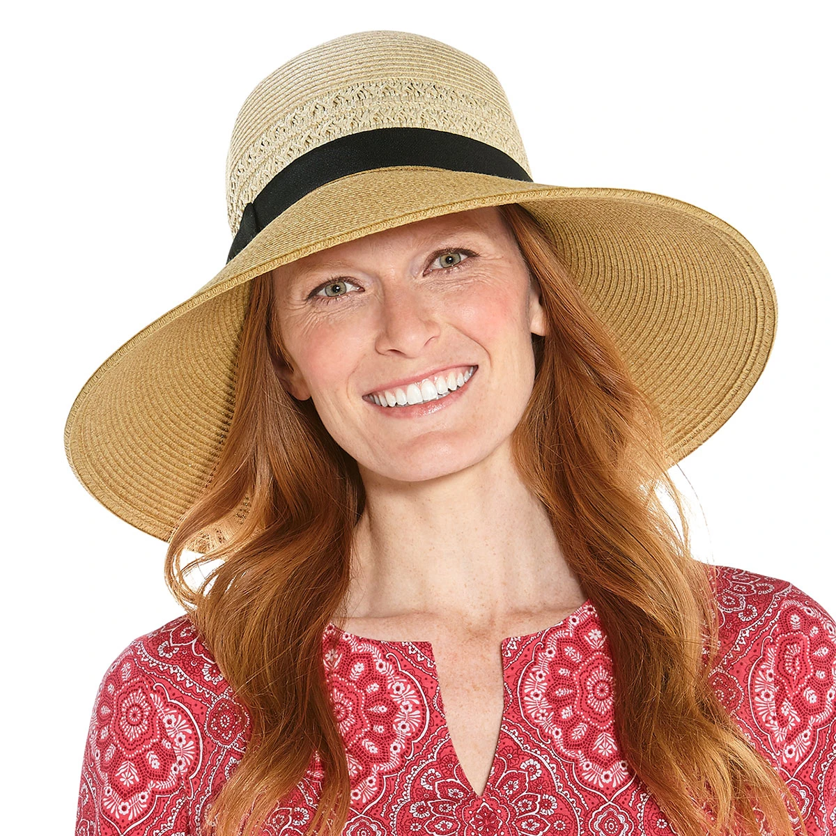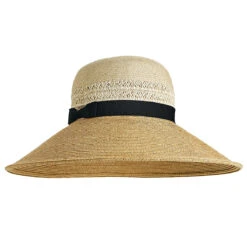 The Shannon Wide Brim Beach Hat by Coolibar is a technically elegant way to completely protect your face and neck. The 5″ UPF 50+ brim turns slightly downward to shield your face and extend completely over the sun-sensitive back of the neck. The brim and crown feature a grosgrain novel weave broken up by a black ribbon and paper braid feature.