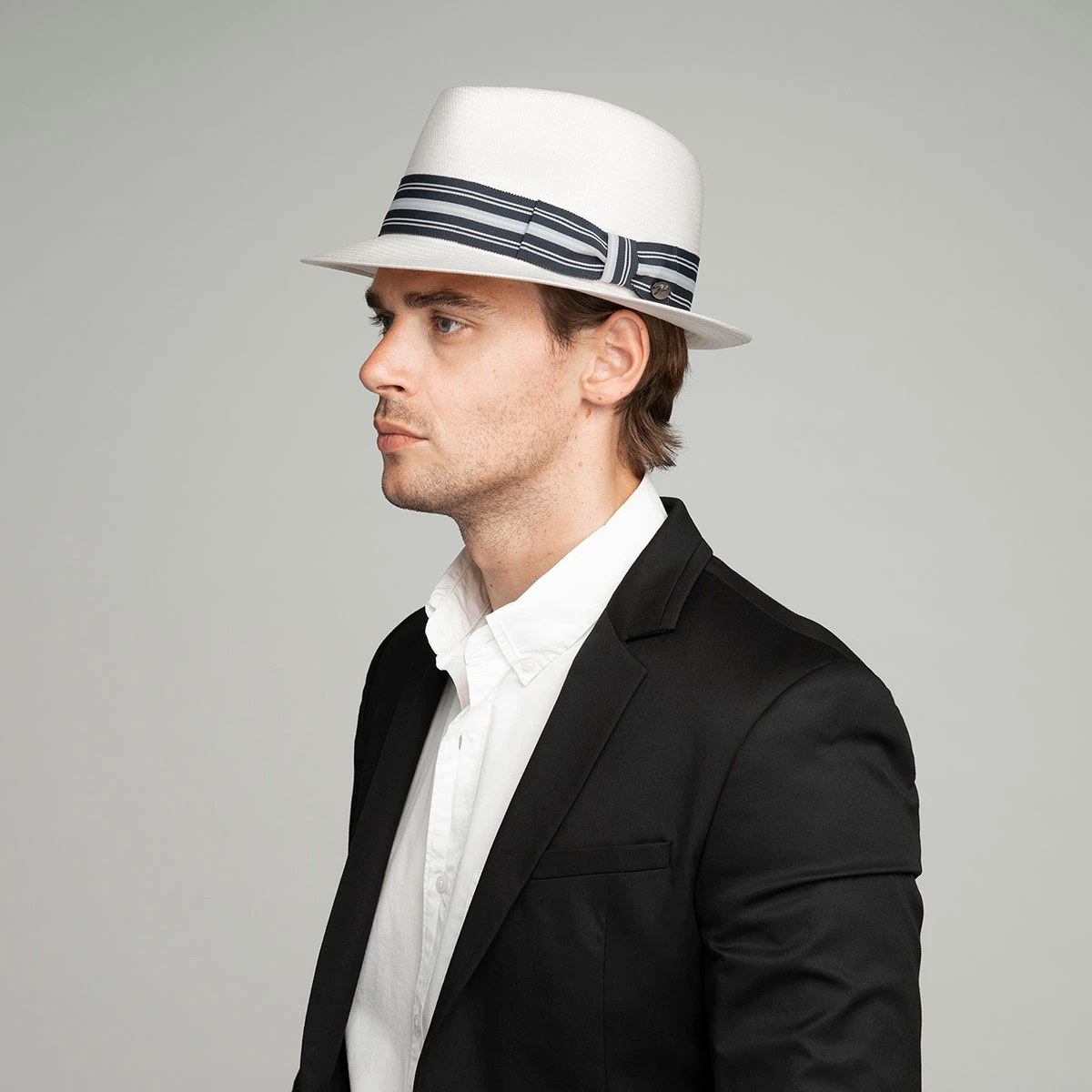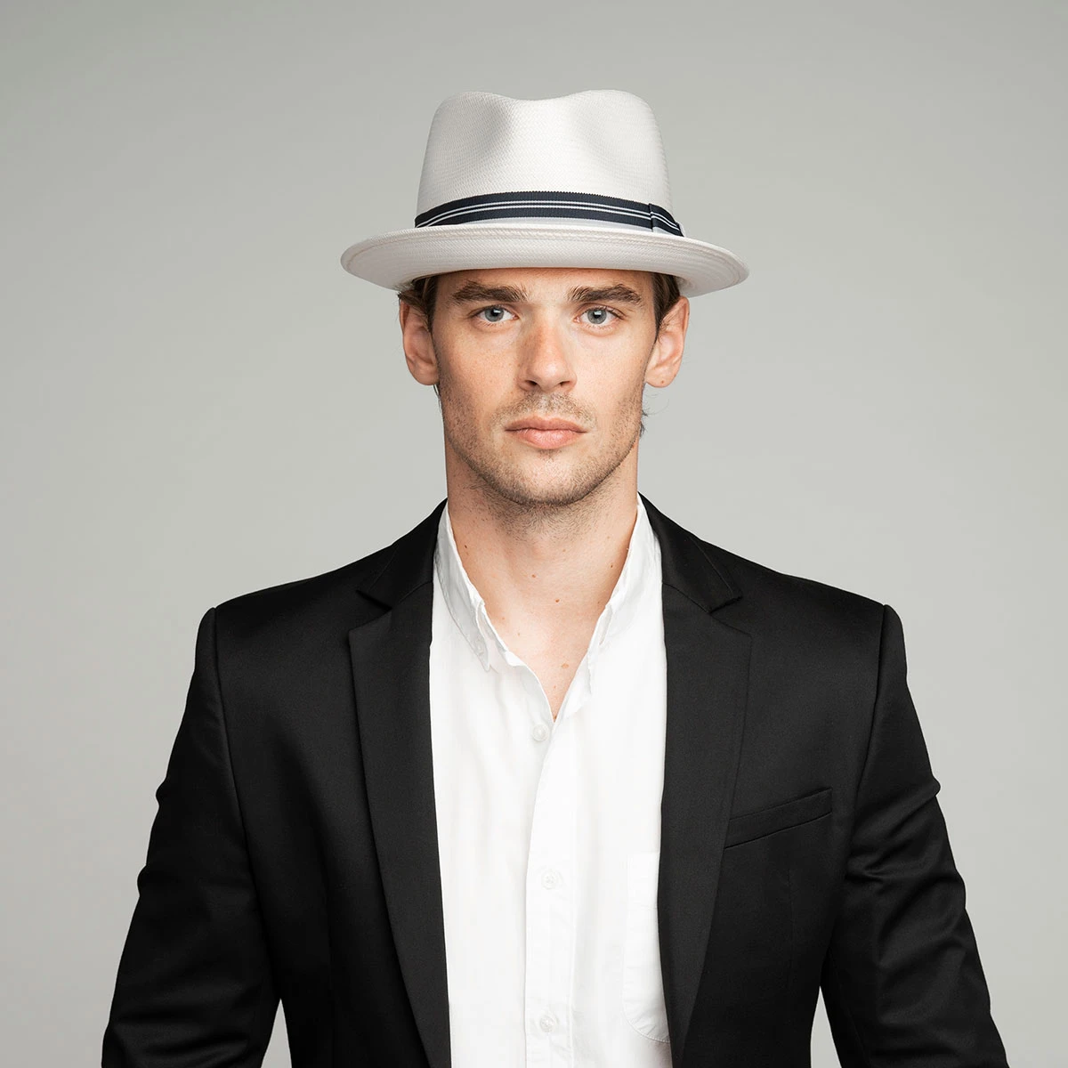 A Shantung ‘straw’ hat is made from high performance paper rolled into a fine yarn and then woven, a process perfected by the Japanese in 610 A.D. This lighter yet very strong ” offered a perfect panama alternative and was dubbed the “Shantung Panama.”Bailey’s finely woven Shantungs are glazed with Bailey’s proprietary LiteStraw® finish to provide a supple feel, water repellency and enhanced shape retention. The Tharp is a classic medium brimmed shape that is available with a seasonal array of band colors. Made in the USA with Globally Sourced Materials