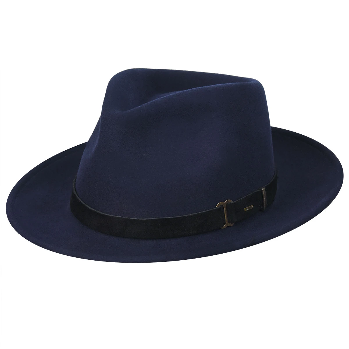 The Treport Fedora by Bailey 1922 features a classic fedora Crown with a medium snap brim. Crafted from Bailey’s signature water repellent, shape retentive LiteFelt® Wool, the Treport features an aged suede band with an antique brass finished loop and clamp to secure it. The Treport is hand-crafted in the USA.