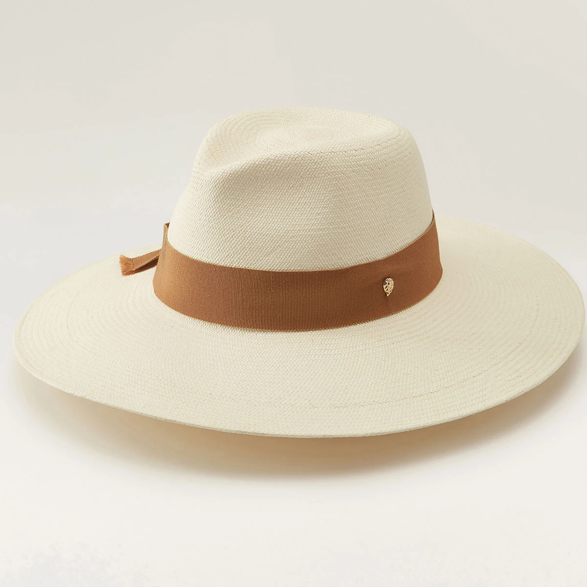 The Vitoria Wide Brim Fedora by Helene Kaminski is a chic Genuine Panama fedora. Hand-crafted from a grade 8 weave, the Vitoria Wide Brim features a 4″ brim accented with an Italian grosgrain ribbon trim with classic bow. It is finished with a sateen elastic size adjustable inner band for the ideal fit.