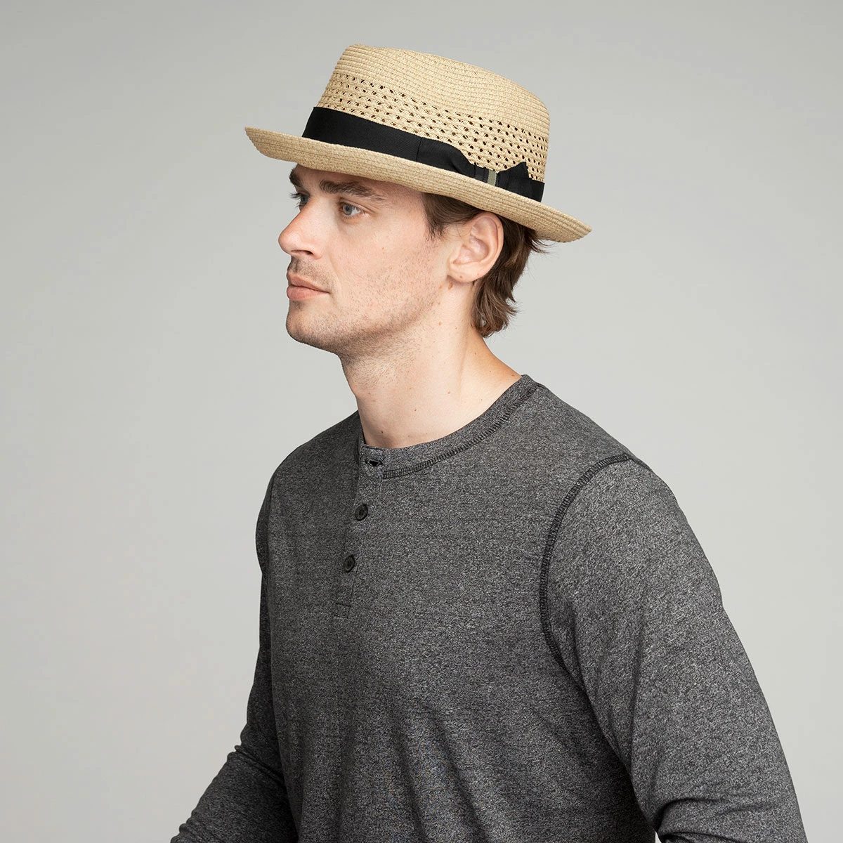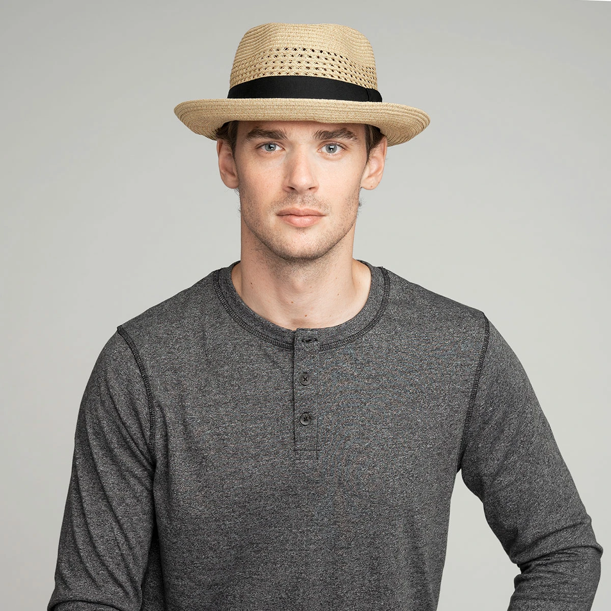 This isn’t your typical straw hat. It’s constructed out of an ultra-fine toyolene braid and finished with a traditional grosgrain band for exceptional comfort and durability. The rounded teardrop crown delivers a timeless look, and the vented pattern keeps your head cool even on those scorching days and nights. The Bailey Wilshire is available in black, copper, navy, sand, shell, and solid black.