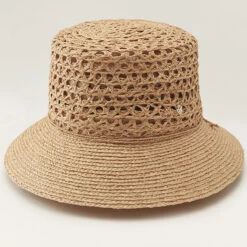 The Zandar Bucket by Helen Kaminski combines an open weave braid with Helen Kaminski’s signature raffia braid. The playful open weave of the crown gives this unique bucket hat a chic look, adding dimension and texture to this style. The raffia braid brim provides sun protection and a polished look. The crown and brim are accented with a hand-rolled raffia string and Helen Kaminski logo seed.